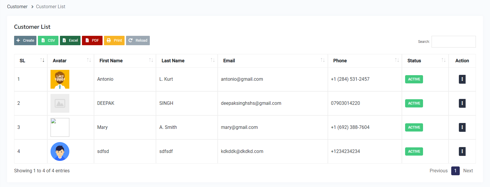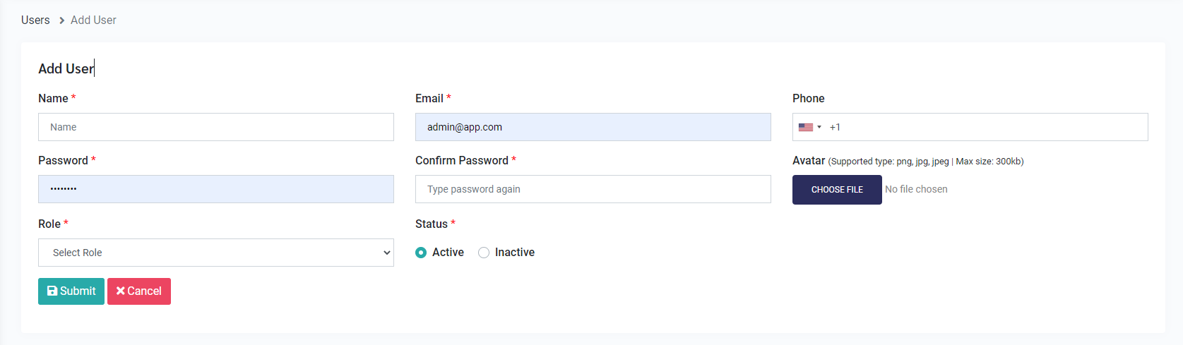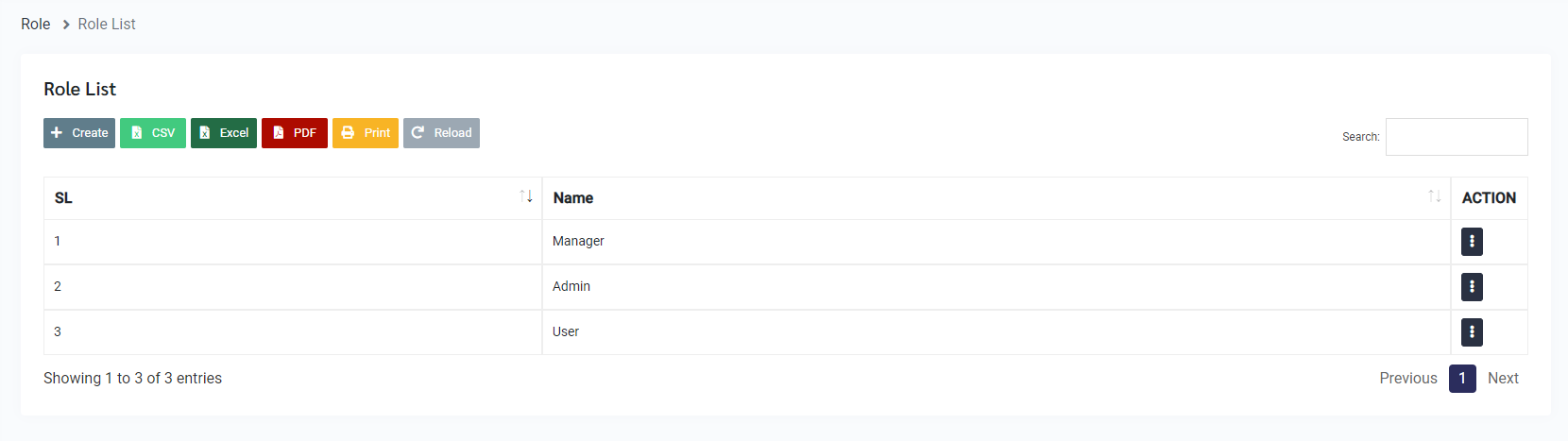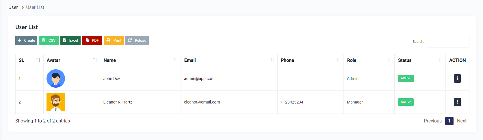 When clicked on this Sub-Module, you can see the User List. You can also create a new User, edit or delete any existing Users.
