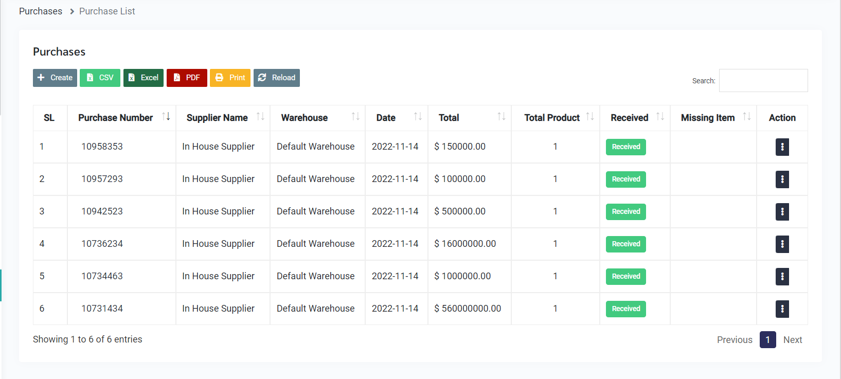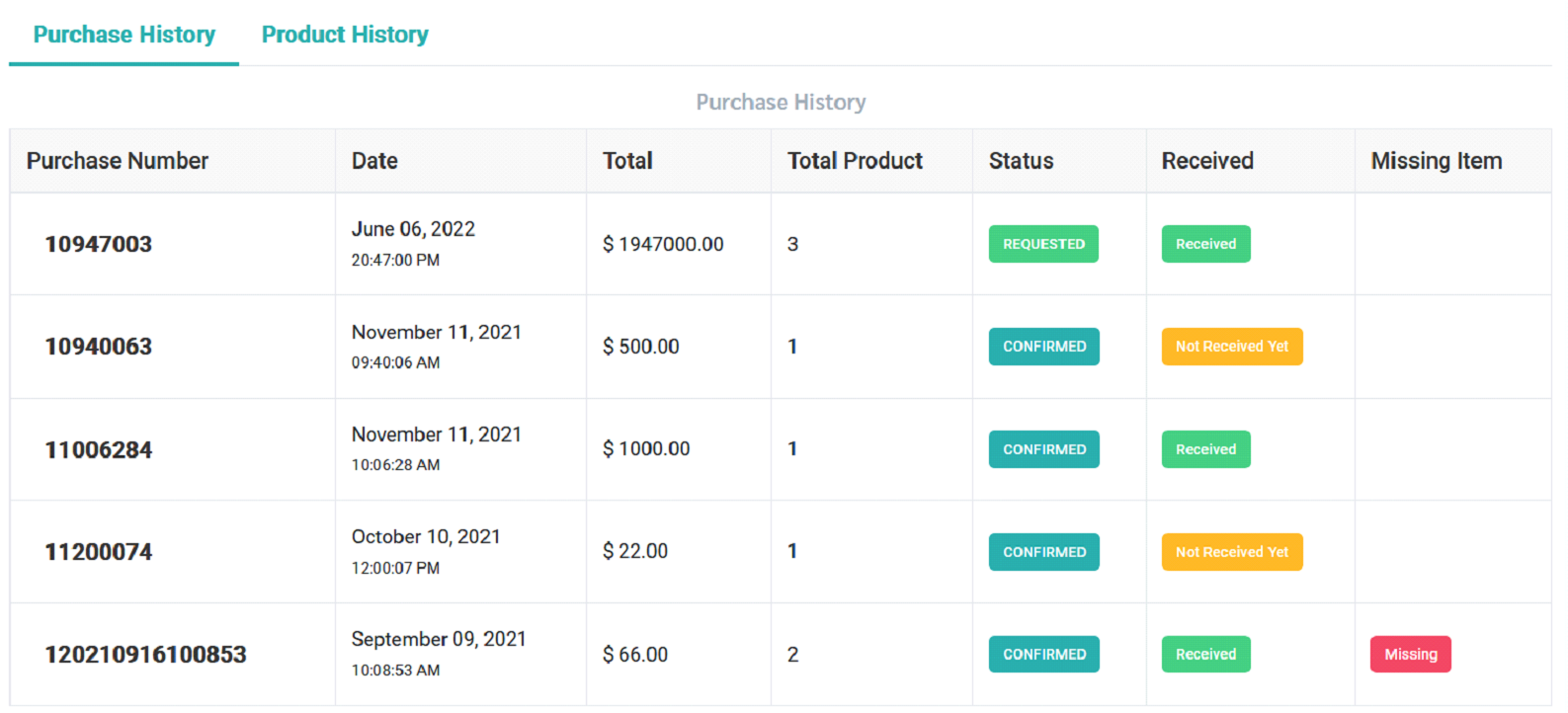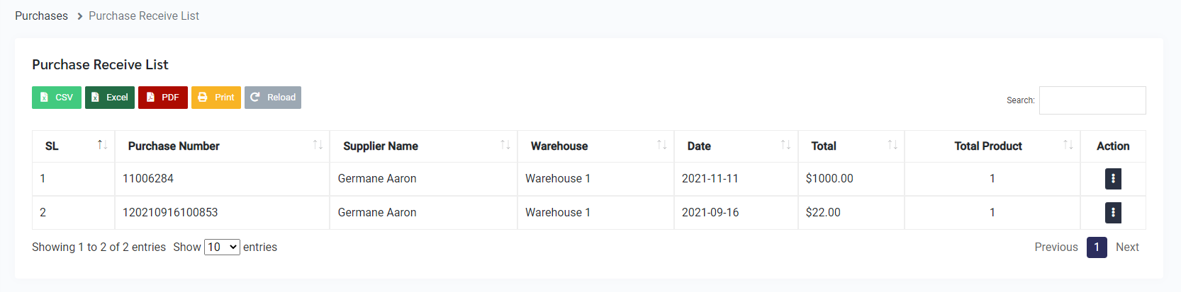 This sub-module allows the User to find information on the Recieved Purchases created using the system.